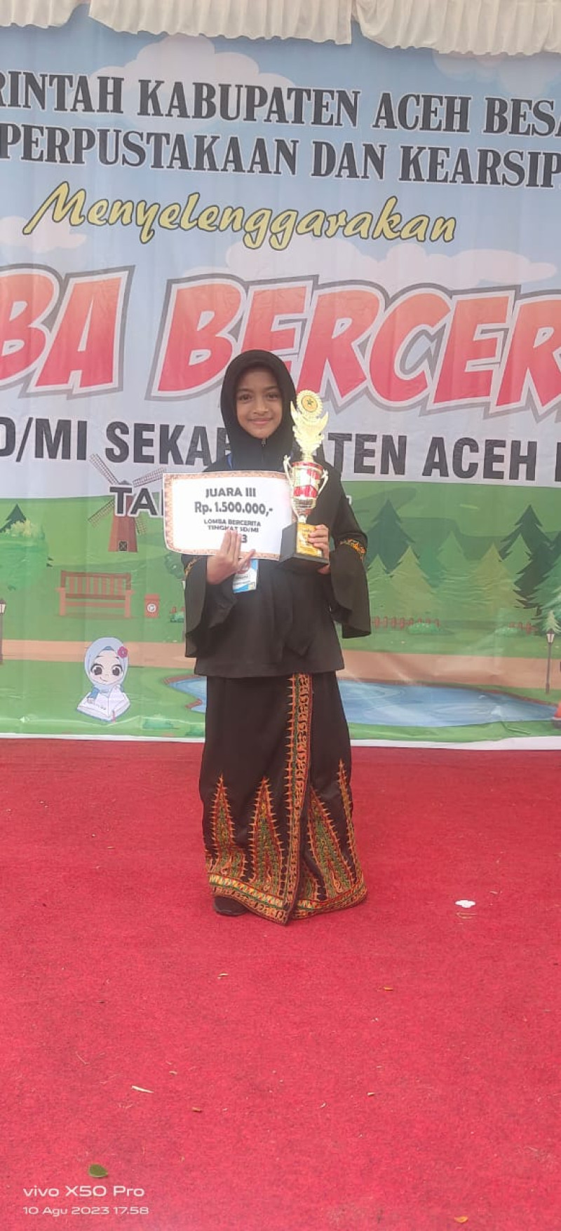 Salah satu siswa MIN 10 Aceh Besar, Anisa Faidha Syakira yang sering di sapa Syakira, berhasil meraih juara III lomba bercerita Tingkat SD/MIN se- Aceh Besar yang di selenggarakan oleh Dinas Perpustakaan dan Kearsipan Aceh Besar, Kota Jantho, Kamis (10/08/2023).