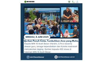 Minggu, 8 Juni 2025/ 12 Zulhijjah 1446 Hijriah, sebanyak 21 Shahibul Qurban dari MIN 10 Aceh Besar melaksanakan penyembelihan hewan qurban di halaman MIN 10 Aceh Besar.Daging qurban dibagikan selain kepada shahibul qurban, juga untuk dewan guru, komite, masyarakat sekitar...